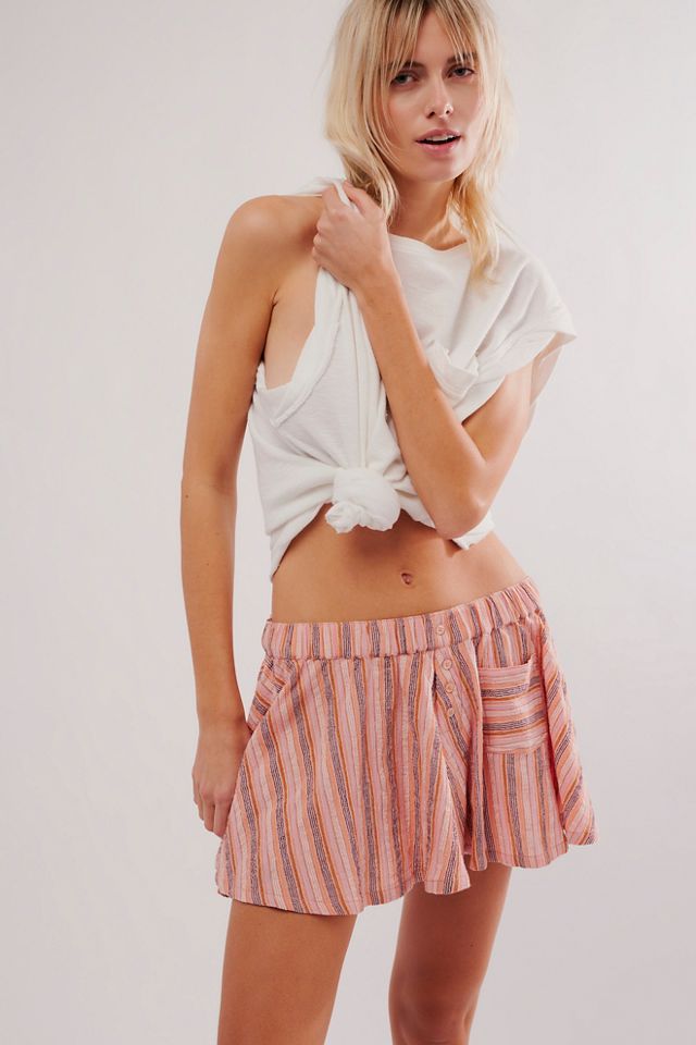 Coupe : Taille basse, coupe micro mini Caractéristiques : Design à enfiler, détail de bouton à l'avant inspiré des vêtements de nuit, poche avant, imprimé à rayures teintes dans la masse Pourquoi on l❤ : Élégante avec des bottes hautes ou décontractée avec des baskets sportives, ce style offre d'innombrables façons de le porter.