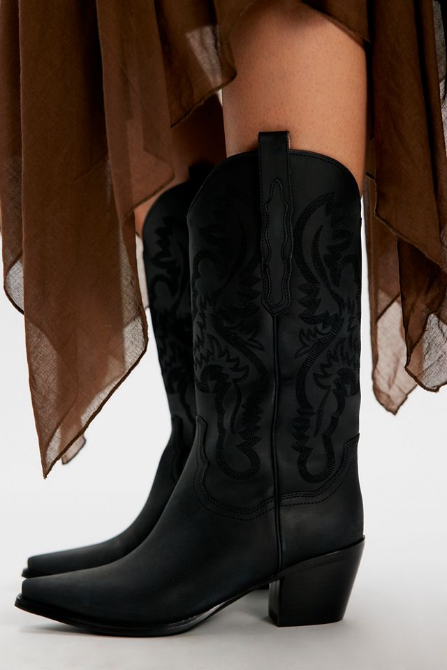 Stun in these so cool western-inspired boots from Jeffrey Campbell featuring classic embroidered details in a luxe leather design with a pointed toe and block heel.