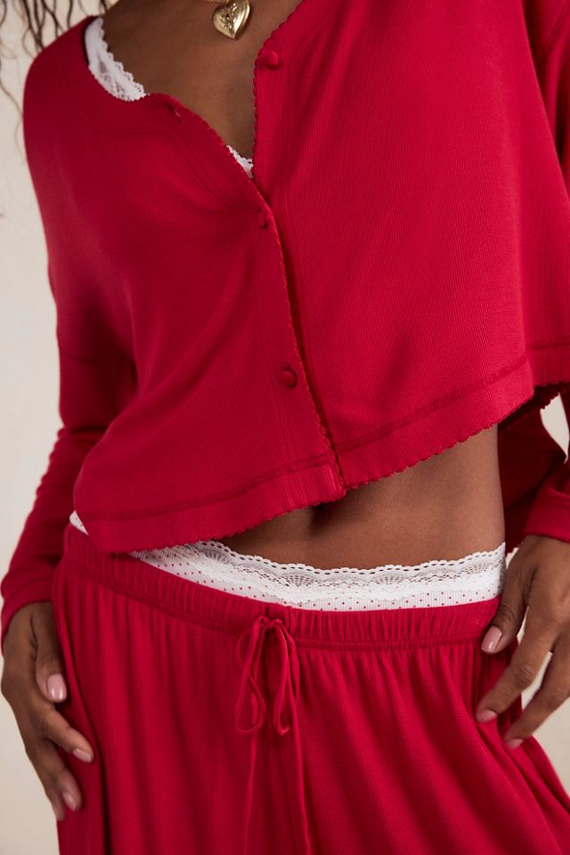 Slouchy silhouettes and super soft fabric make this lounge set from Intimately the perfect cozy addition to your sleep styles, featuring a thermal knit fabrication, a button-down top with drop shoulder sleeves, and elasticated, wide-leg pants with side patch pockets.