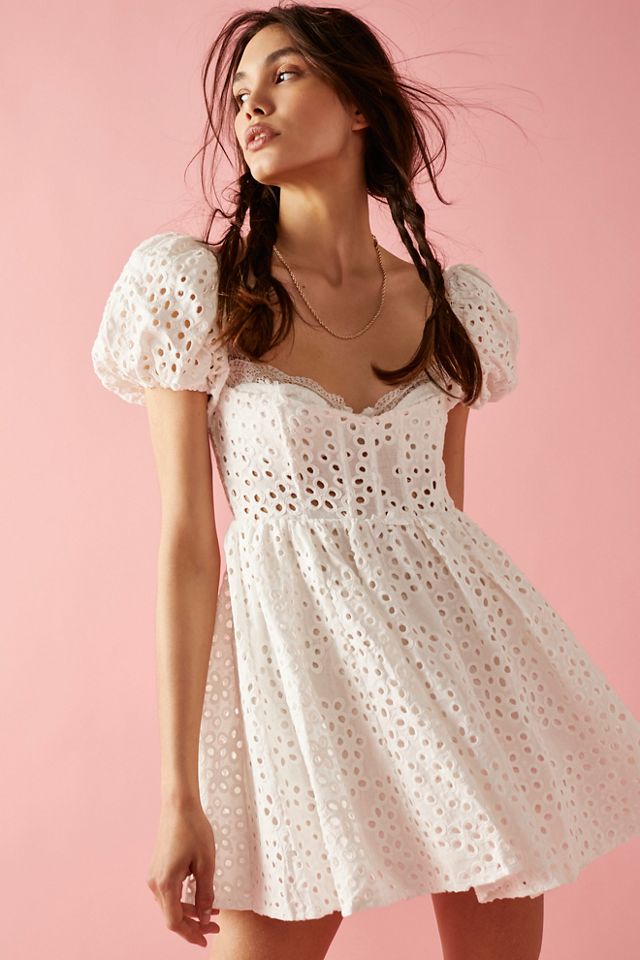 Turn heads in this totally timeless mini dress featured in a puff-sleeve silhouette with sweetheart neckline and classic eyelet lace fabrication with bralette-inspired, lace trim at center for added dimension.