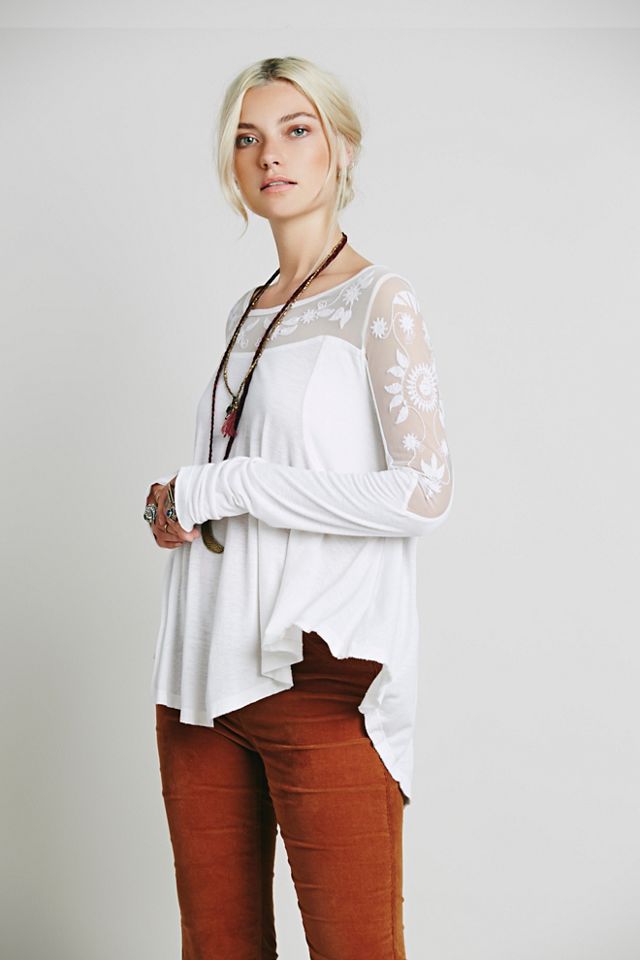 Romantic long sleeve tee with sheer yoke, featuring floral elements. Swing silhouette. *Dreamy fabrics, slubby textures, and ethereal sheer details come together to create New Romantics, a collection of pieces that are hand touched and hopelessly romantic.