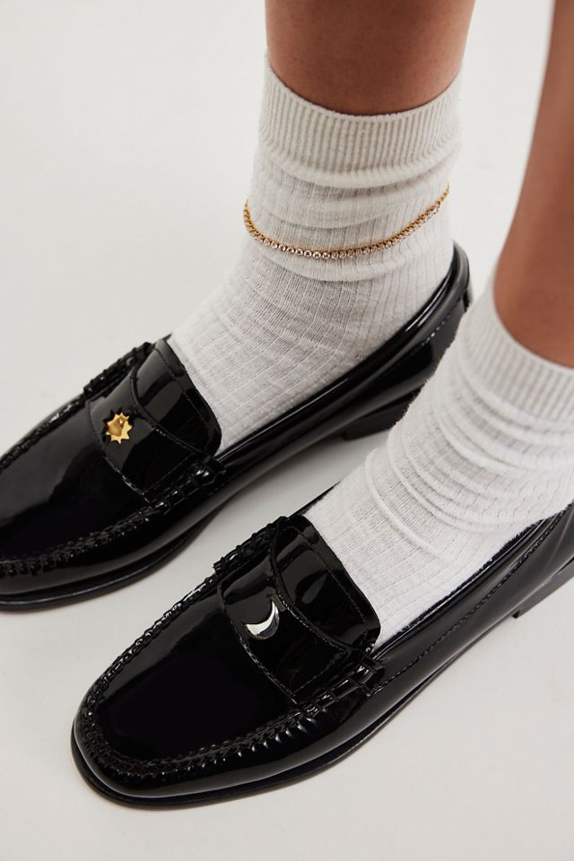 Features: Slip-on style, classic loafer construction, patent leather fabrication, pointed toe, slight heel, graphic detail at penny slot