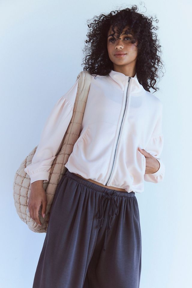 Full-zip sweatshirt made to top off your active look. Cut in a relaxed silhouette from ultra-comfy fabrication and topped with pleated details for a femme finish.