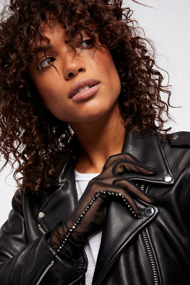 Sheer mesh gloves with ruched sides and shimmering rhinestone embellishments for a glam touch.