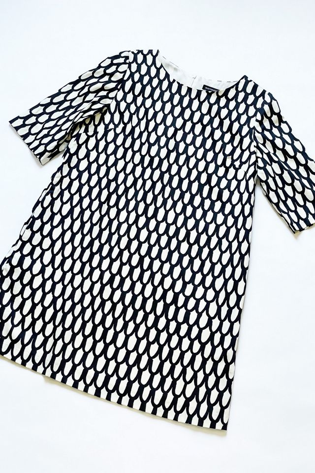 Classic Marimekko black/white graphic print dress. Looks like fish scales. Short sleeves. Wide scoop neck. Slight A Line shape. Fully lined. Long hidden zipper in center back. 2 hidden slit pockets.