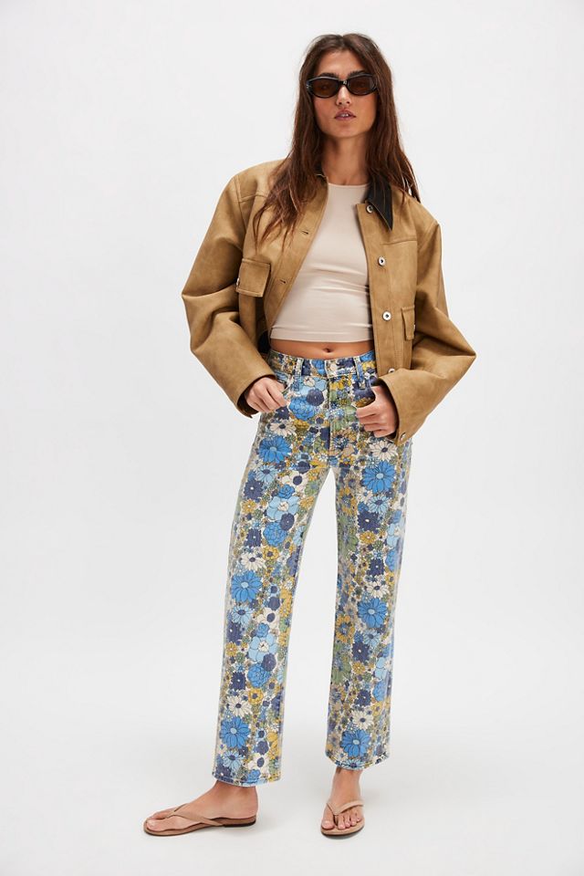 Features: Zip fly and button closure, five-pocket design, ankle-length inseam, bold floral print throughout