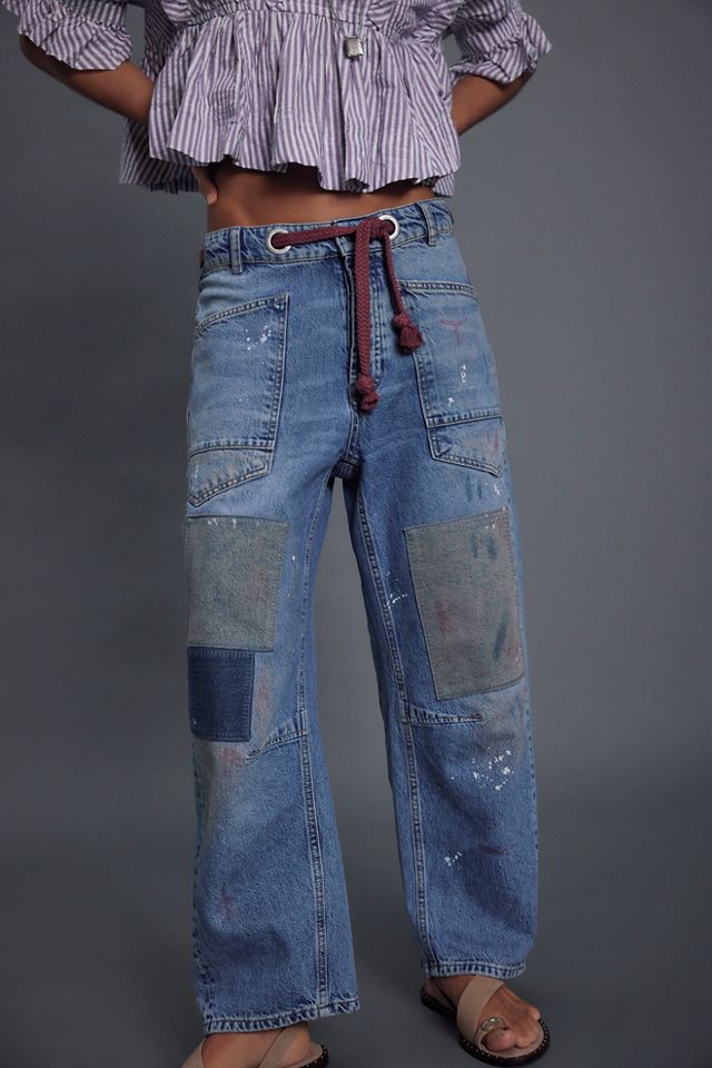 Features: Distressed detailing throughout, paint splatter features, oversized patch pockets, contrast drawstring waist, pull-on style