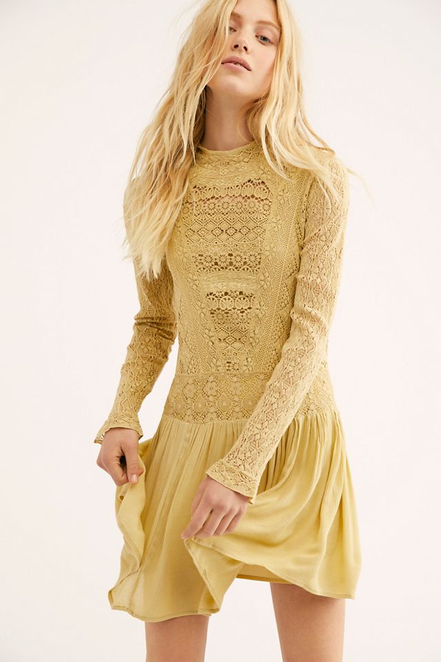 Flowy drop waist dress featuring a beautiful sheer crochet lace overlay with long sleeves and a high neck.