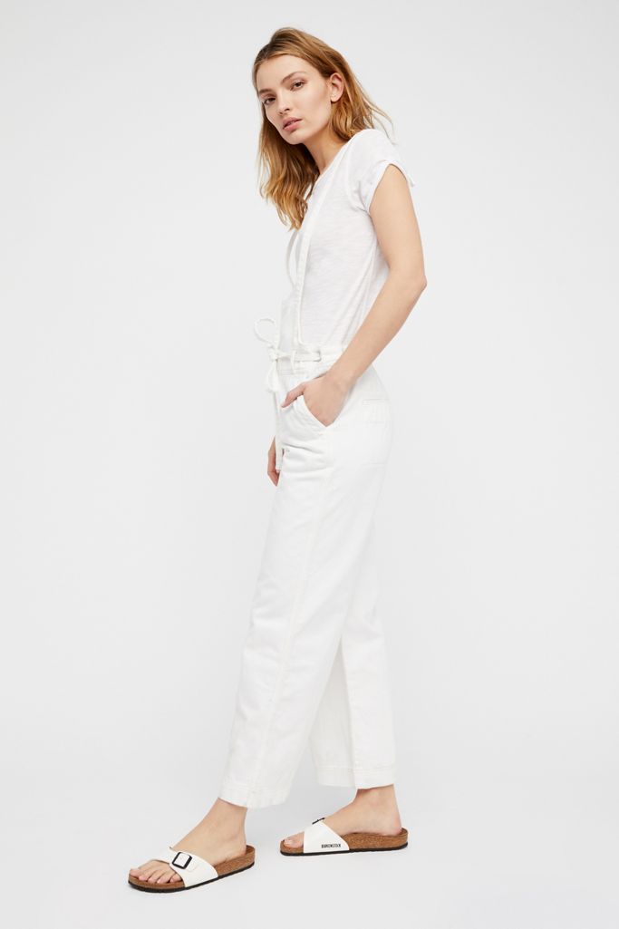 Cropped denim one piece featuring an adjustable drawstring waistband.