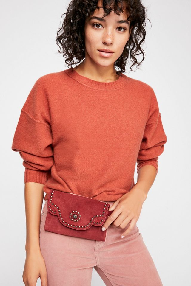 Small leather belt bag with stud detailing and magnetic closure.