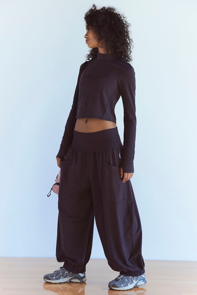 Features: Top: Mock neckline; long sleeve style; thumbhole detail Pants: High-rise design; harem-inspired silhouette; exaggerated pockets; elasticated waist and ankle cuffs