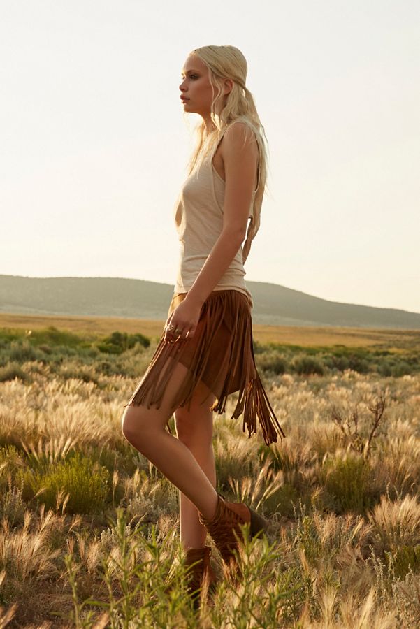 Stretch vegan suede mini skirt with croco-textured patches, asymmetrical hem, and statement fringe trim.