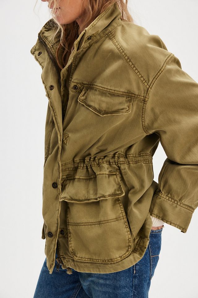 Taking notes from workwear styles, this utility-inspired jacket from We The Free is featured in a pocket-adorned safari style with a cinched waist, adjustable hem, and seamed details.