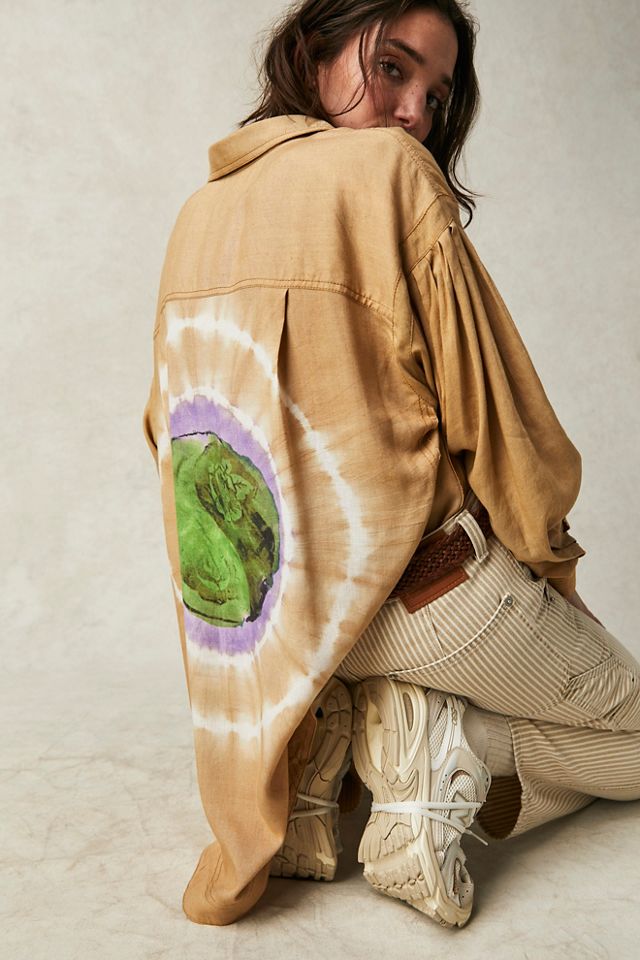 Taking the classic buttondown to the next level, this timeless top is featured in a slouchy, relaxed fit with staple collar, dropped shoulders for shape, and tie-dye-adorned detail at back for an added special touch.