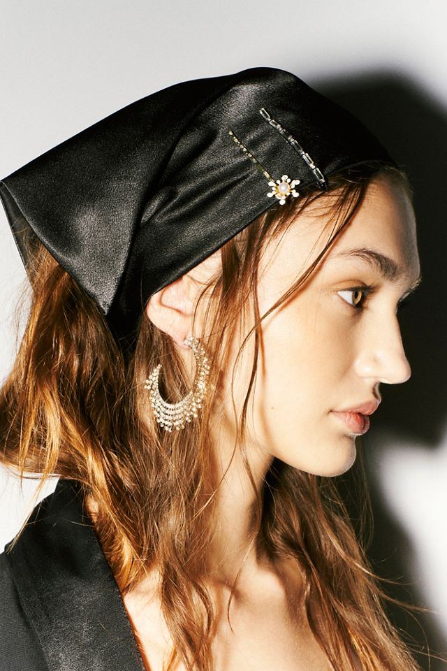 Add a delicate touch to your everyday hairstyle with this so sweet and simple scarf featured in a silky fabrication and classic triangle shape with a stretchy elastic and dainty embellished hairpins.