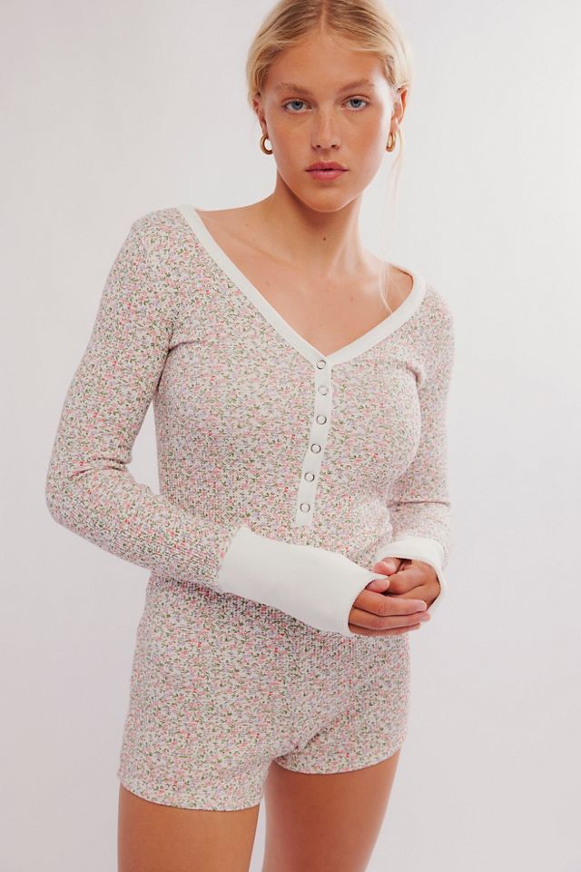 Forever cozy in soft waffle, this long-sleeve romper from Frankies Bikinis features a henley-style button detail and darling floral print for an irresistible style you won’t want to take off.