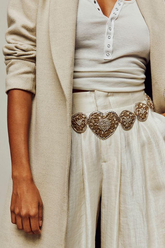 Designed to take absolutely any look to the next level, this stunning belt is featured in a chain-inspired design with metal heart detailing and leather piecing at back for added dimension.